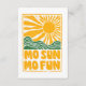 Experimente la energía radiante de Sunny Fun Fiesta, una obra de arte vibrante con un sol amarillo brillante con rayos dinámicos, colocado sobre líneas onduladas verdes y blancas que recuerdan a colinas o olas. Con una tipografía audaz y amarilla que proclama MO SUN MO FUN, este diseño captura la esencia de alegría y positividad en los días soleados. Perfecto para los amantes del arte moderno y lúdico, esta pieza le da un toque de alegría y encanto a cualquier espacio, accesorio o armario.