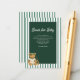 Invite a sus huéspedes a compartir un regalo de amor duradero con nuestra tarjeta Books for Baby Enclosure, diseñada para complementar su colección de Baby Shower Preppy Tennis Bear. La tarjeta presenta el suave título "Libros para Bebé" en un guión retro y lindo, emparejado con un texto elegante en un tipo de letra serif clásico para un aspecto atemporal. Está rodeado por un fondo de rayas verdes y blancas inspirado en el estilo de un club campestre y se coordina con gusto con el tema de los perritos. Incluirla con su invitación a pedirle amablemente a los huéspedes que traigan un libro infantil favorito en lugar de una tarjeta, creando una biblioteca de historias que su pequeño apreciará en los próximos años.