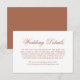 Tarjeta tradicional de envoltorio boda de terracota con la palabra "detalles" en una caligrafía elegante. Todo el texto está en naranja quemado / oxidación sobre un fondo blanco y puede cambiarse a cualquier color que desee haciendo clic en el botón "personalizar". Utilice estas tarjetas para proporcionar instrucciones y cualquier otro detalle importante de los bodas que sus huéspedes puedan necesitar, como alojamiento en el hotel, aparcamiento, información de transporte, etc. Este diseño clásico es perfecto para un boda formal.