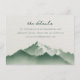 This wedding enclosure card features a serene and nature-inspired design with a minimalist layout on textured, off-white paper. The color palette includes soft, muted greens that create a tranquil atmosphere, complemented by an abstract watercolor mountain range at the bottom. Elegant cursive typography highlights "the details," while simple serif font provides clear instructions for further information, ensuring both style and readability. The overall mood is peaceful and inviting, making it perfect for couples seeking a harmonious and natural aesthetic for their special day.