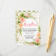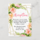 This fun and whimsical wedding reception enclosure card features watercolor pink and orange hibiscus flowers, monstera leaves and foliage on a gold geometric frame. The text combines handwritten script and serif fonts for a stylish and modern look. This is perfect for a spring or summer rustic wedding.