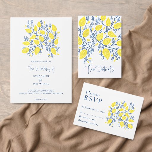 Esta encantadora tarjeta RSVP está diseñada para coordinarse con su suite boda, con una combinación alegre y brillante de amarillo limón y azul. El audaz y elegante "RSVP" en escritura azul llama la atención, mientras que las instrucciones, incluidos los nombres de la pareja y la fecha límite de RSVP, se muestran en una fuente serif limpia y fácil de leer. La parte inferior de la tarjeta está decorada con un delicioso ilustracion de rama de limón que le da un ambiente animado y refrescante. Perfecto para bodas de primavera o verano, esta carta logra el equilibrio justo entre la formalidad elegante y la alegría vibrante.
