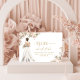 Este encantador diseño presenta una impresionante novia en acuarela adornada con un vestido de novia blanco que fluye, rodeada de un delicado arreglo de flores rosadas.