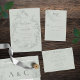 Elementos: Vinos dibujados a mano sobre un fondo verde sabio suave. Las fuentes incluyen escritura moderna y serif clásico. Colores: verde salvia, verde menta, gris, pizarra. Temas: moderno, rústico, minimalista, mínimo, sutil, romántico, vitícola, orgánico, botánico. Colección: Colección Minimalista de Bodas de color verde azulado de Vines dibujados a mano. Tipo de producto: Tarjeta de cierre