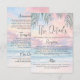 A soft pastel sunset watercolor background blends pinks, oranges, and purples over the ocean, with gentle waves meeting the shore. Delicate palm leaves frame the top, adding a tropical, airy touch. The design appears on both sides, with space for accommodations, reception location, dress code, transportation, wedding website, and more. A refined mix of elegant script and classic serif fonts gives a stylish yet relaxed look. Text is in dark gray by default, but all fonts, wording, and colors can be customized to suit your celebration perfectly.