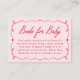 Encourage guests to help build baby’s first library with this books for baby request card from the Whimsical Little Sweetheart Valentines Baby Shower collection. The design features “Books for Baby” displayed in a handwritten red script on a soft pink background, followed by custom wording asking guests to bring a book instead of a card. A hand-drawn red ribbon frame accented with small heart details surrounds the layout for a charming Valentine-inspired look. The back of the card features coordinating pink and red stripes, creating a polished and cohesive finish. Sweet, thoughtful, and whimsical, this books for baby card is a lovely addition to a sweetheart-themed or Valentine baby shower.