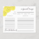 Pídele a los huéspedes de la ducha de novia que compartan su receta favorita con la futura novia con esta sencilla tarjeta "Una receta especial". Este diseño tiene limones acuarelas y los artículos de coordinación están disponibles en nuestra tienda.