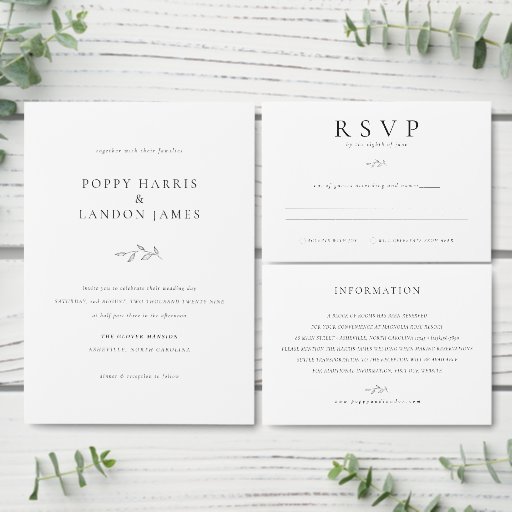 La tarjeta de información de boda con simple elegancia presenta una tipografía clásica en negro sobre blanco con una rama de hoja de ceniza - arte lineal botánico.