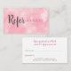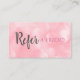 Una tarjeta de referencia rosa moderna de moda con un bokeh rosado de color bonito como fondo con tipografía elegante. Perfecto para una amplia gama de profesiones incluyendo: esteticistas, consultores de cabello y belleza, estilistas, maquilladores y spas por nombrar algunos! Personalice agregando su información de contacto al revés con su oferta especial de descuento. Diseñado por Thisisnotme©