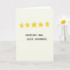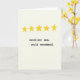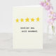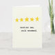 Esta tarjeta presenta cinco formas de estrellas doradas y amarillas agrupadas en la parte superior, cada una con bordes ligeramente desiguales que las hacen sentir cálidamente humanas y un poco afectuosas ❤️. Las estrellas se sientan como un pequeño cielo de alabanza, sugiriendo un vínculo tierno y de apoyo a través de su colocación agrupada, casi "reunida". Debajo de ellas, centradas en la página, aparecen dos líneas cortas de texto en una fuente de estilo máquina de escribir en negro sólido. La primera línea dice "excelente mamá" y la segunda línea debajo dice "se recomienda" con un espaciado generoso que mantiene el mensaje calmado y confiado. El diseño es simple y abierto, dejando que las estrellas y las palabras se sientan como una nota tranquila compartida entre amigos cercanos o familiares. Un fondo suave de color blanco desvanecido con una textura tenue similar al papel agrega un toque suave y acogedor 🌼. El texto negro se encuentra en la parte media-inferior,
