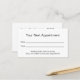 Esta tarjeta de cita dental profesional es de doble cara. La primera parte dice "Su próxima cita" y tiene líneas para la fecha y hora de la cita. En la parte inferior, hay un texto que puede editar para crear un mensaje personalizado si lo desea. (Muestra: Por favor, avise de 24 horas si no puede mantener su cita.) La segunda cara tiene texto para mostrar que se reemplaza con el nombre del dentista (o nombre de la práctica) y su dirección, número de teléfono y sitio web. Todo el texto se puede editar o eliminar. El texto es negro.