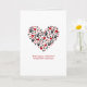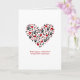 Tarjeta blanca con huellas negras y corazones rojos en forma de corazón con “Deseándote un corazón lleno de hermosos recuerdos” debajo en rojo.