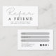 Impulse su negocio con una tarjeta de descuento de referencia para un amigo! Recompense a sus clientes fieles y atraiga nuevos con nuestra plantilla de tarjeta de descuento de referencia para un amigo. Aliente a sus clientes a difundir su negocio y ver crecer sus ventas. Esto es lo que incluye nuestra plantilla: Diseño de personalizable completo: Personalice la tarjeta con el logotipo, los colores y la mensajería de su marca para convertirla realmente en la suya. Instrucciones simples: Explique claramente cómo funciona la tarjeta para que sus clientes puedan entender y empezar a referir a sus amigos con facilidad. Opciones de descuento flexibles: elija el monto o porcentaje de descuento que mejor funcione para su empresa y sus clientes. Al usar nuestra tarjeta de descuento de referencia para un amigo, usted puede: ⟶ Aumentar la lealtad del cliente: Sus clientes apreciarán la oportunidad de ahorrar dinero y ser recompensados por sus remisiones. ⟶ Adquirir nuevos clientes: Es probable que sus clientes actuales remitan a sus amigos y familiares, lo que puede ayudarle a llegar a nuevos públicos y a ampliar su base de clientes. ⟶ Aumentar las ventas: Cuantos más referencias obtengas, más ventas harás y más exitoso será tu negocio. Obtén tu plantilla de tarjeta de descuento de referencia para un amigo hoy mismo y empieza a impulsar tu negocio!