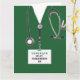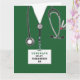 Tarjeta de graduación creativa de la escuela de enfermería con exfoliaciones únicas de hospital verdes, un estetoscopio y un cuchillo del ejército suizo. Para personalizar el texto de edición para añadir el nombre de la enfermera.