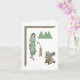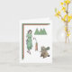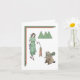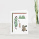 Pulseras de bombillas de Navidad cuelgan de sus muñecas, y detrás de ella hay un grupo de árboles de Navidad estilizados.