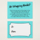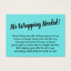 Si estás hospedando una ducha sin regalo para una futura novia, esta tarjeta divertida y simple podría ser la elección para ti. Usando un elegante tipo de letra de guión, primero añadí un encabezado que dice "¡No se necesita ajuste!" en la parte delantera, y "A" y "Desde" en el lado de la etiqueta de regalo. El campo de plantilla se ha creado para ofrecer instrucciones a los clientes que no cumplan con su presente; por favor, no dude en cambiar la redacción de la manera que desee. Hay muchas alternativas populares a este texto, si quieres un cambio. Todos los tipos de letra y colores se pueden modificar según se considere oportuno.