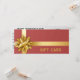 Elegante, noble, simple y glamuroso arco de regalo de oro y cinta de satén dorada sobre fondo rojo exuberante. Este elegante y festivo certificado de regalo es perfecto para su pequeña empresa o para regalar a amigos y familiares.