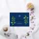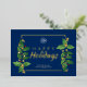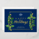 Clásico moderno horizontal feliz vacaciones negocios impresión a ambos lados tarjeta plana de saludo con un lugar para su logo con elegantes hojas de navidades de acuarela clásicas y verdadero marco prensado de Relieve metalizado dorado y feliz texto de vacaciones en un fondo azul marino. La tarjeta de felicitación de Navidades perfecta para empresas de negocios, pequeñas empresas, empresas, empleados, empresas de vacaciones o cualquier organización, el diseño moderno dará a sus clientes la impresión de lujo y éxito. La parte trasera tiene una redacción personalizado. Esta plantilla de tarjeta Happy Holidays está lista para tu personalización en línea. El Relieve metalizado de oro se puede cambiar a oro o plata subió.