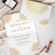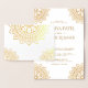 Invite a sus huéspedes con esta hermosa invitación de bodas plegadas que incluye un intrincado arte floral con una auténtica impresión de Relieve metalizado dorado en el exterior. Simplemente agregue los detalles de su evento en esta plantilla fácil de usar para convertirla en una invitación única. Atención: el Relieve metalizado dorado sólo se imprime en el exterior y no en el interior.