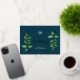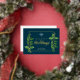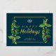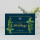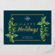 Clásico moderno horizontal feliz vacaciones negocios impresión a ambos lados tarjeta plana de saludo con un lugar para su logo con hojas clásicas de navidades de acuarela y verdadero marco prensado de Relieve metalizado dorado y feliz texto de vacaciones en un elegante y oscuro fondo verde azulado. La tarjeta de felicitación de Navidades perfecta para empresas de negocios, pequeñas empresas, empresas, empleados, empresas de vacaciones o cualquier organización, el diseño moderno dará a sus clientes la impresión de lujo y éxito. La parte trasera tiene una redacción personalizado. Esta plantilla de tarjeta Happy Holidays está lista para tu personalización en línea. El Relieve metalizado de oro se puede cambiar a oro o plata subió. Este hermoso crédito fotográfico es para: Libby Penner