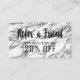 Este moderno y sencillo patrón de mármol blanco y negro, refiérase a un amigo tarjeta de referencia de descuento es perfecto para el moderno y elegante propietario de negocios. Esta tarjeta de aspecto profesional y de moda es la manera perfecta de mostrar a sus clientes que se preocupan por su negocio. Personalizar esta tarjeta para cualquier negocio, sólo edite el texto y agregue sus propios datos personales.