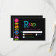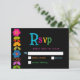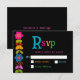 Añada un toque vibrante a su suite boda con esta tarjeta RSVP mexicana moderna, diseñada con un marco floral colorido sobre un fondo negro negrita. Inspiradas en el arte folclórico tradicional mexicano, las ricas flores dibujadas a mano en tonos rojos, amarillos, rosas y turquesas aportan energía festiva y encanto cultural al diseño. El sorprendente contraste aumenta la legibilidad y al mismo tiempo mantiene un ambiente sofisticado y moderno. Perfecto para las parejas que buscan infundir los detalles de sus bodas con personalidad, patrimonio y animada elegancia.
