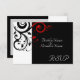 Tarjeta de respuesta pequeña para coincidir con nuestra invitación de boda con remolino rojo y negro + blanco, con un fondo gráfico en negrita con hojas enrolladas. Personalice en línea con los detalles de su boda.
