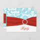 Esta tarjeta de respuesta de damasco floral azul acua y blanco tiene una cinta ROJA IMPRIMIR y una hebilla de joya IMPRIMIR que coincide con la invitación de boda que se muestra a continuación. TAMBIÉN, si cambia el tamaño de la tarjeta, o si cambia las fuentes, o el tamaño de la fuente, parte del diseño y/o texto puede cortarse. Todo se imprimirá como lo ve en su monitor. No veré su invitación, y Zazzle NO corregirá nada (errores tipográficos, desalineación, etc.). El texto y el papel son totalmente personalizables. Si necesita ayuda con esta invitación, por favor envíeme un correo electrónico ANTES de realizar su pedido. Si necesita otros artículos coincidentes, por favor envíe su solicitud a niteowlstudio@gmail.com.