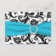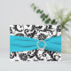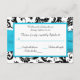 Esta tarjeta de respuesta de damasco en blanco y negro tiene una cinta impresa de color azul aqua y un broche de joya de diamante impreso que sería perfecto para una boda con tema aqua y negro. Algunos de los papeles alterarán el color del diseño, así que tenga cuidado si elige el papel de fieltro, ya que puede amarillear más de lo que desea. NO usaría los papeles metálicos dorados o plateados, ya que oscurecerán el diseño sin agregar ningún brillo adicional al que obtendría con los papeles metálicos de hielo o champán. TAMBIÉN, si cambia el tamaño de la tarjeta, o si cambia las fuentes, o el tamaño de la fuente, parte del diseño y/o texto puede cortarse. Todo se imprimirá como se ve en su monitor. No veré su invitación, y Zazzle NO corregirá nada (errores tipográficos, desalineación, etc.). El texto y el papel son totalmente personalizables. ****POR FAVOR TOME NOTA de que la tarjeta de respuesta pequeña (3,5”x5,0”) es la ÚNICA tarjeta que cabe en el sobre para la invitación cuadrada de 5,25”, si corresponde. Si necesita ayuda con esta invitación, por favor
