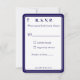 El diseño del anverso presenta el formato tradicional para una tarjeta de respuesta de boda en una fuente azul marino sobre un fondo blanco. La imagen de una cruz se muestra en la esquina superior. Todo el diseño está enmarcado por un borde elegante azul marino y blanco.