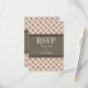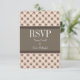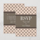 Tarjeta de respuesta Boda Fancy Lattice de moda y moda con un diseño de círculo elegante y un patrón de rombo sobre un fondo de melocotón vibrante con un amplio borde marrón de dos tonos. Esta elegante tarjeta RSVP es perfecta para un boda moderno. Fácil de personalizar, simplemente agregue los detalles de su boda en los campos de texto proporcionados. Haga clic en "Personalizar" para encontrar más opciones de personalización.