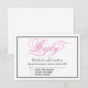 Sofisticada y elegante, esta tarjeta de respuesta de boda con guion de caligrafía rosa moderna, negra y blanca coordina con nuestro conjunto de invitaciones y accesorios de boda cristianos contemporáneos Pink and White Script Faith Hope and Love Wedding Suite de Graphic Suite en Zazzle, diseñado por Natalie Schorr.