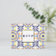 Esta tarjeta postal de respuesta de boda de inspiración mediterránea presenta bordes de azulejos españoles tradicionales llamativos y elegantes en amarillo y azul marino.