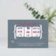 ¡Para todas esas parejas que aman los casinos! Aquí hay una divertida tarjeta de respuesta de boda con máquina tragaperras. ¡Agregue la fecha de su boda! Los colores son gris acero oscuro y rojo. Agregue la fecha de su boda en rojo y diviértase con la segunda fecha, ¡quizás use la fecha en que se comprometieron o incluso su primera cita! Si desea un esquema de colores diferente, por favor envíe un correo electrónico a paula@labellarue.com antes de personalizar o realizar un pedido para que se pueda crear una nueva plantilla para usted.