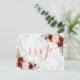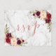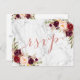 Tarjeta postal de respuesta de boda de borgoña con flores acuarelas vintage chic y guion de lámina de oro rosa falso sobre fondo de mármol gris. Elke Clarke © Otros colores disponibles en www.zazzle.com/monogramgallery. Una respuesta de guion manuscrita simple, pero versátil, para bodas u otras ocasiones especiales como cenas de ensayo, regalos para la pareja, celebraciones de aniversario de boda. El foil de Rose Gold es un efecto de foto impresa.