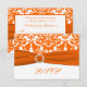 Esta moderna y trendy tarjeta de respuesta de damasco naranja y blanco tiene una cinta impresa de color naranja brillante y un broche de diamantes y joyas impreso que coincide con la invitación de boda que se muestra a continuación. Si necesita algún artículo coincidente en este diseño, por favor envíe un correo electrónico a niteowlstudio@gmail.com.