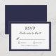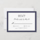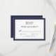 Tarjeta de respuesta de confirmación de asistencia con borde azul marino y gris. Texto con letra de bloque y elegante script. Reverso azul marino.