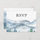 Tarjeta de confirmación de boda con elegante escena rústica de montañas y bosque con acuarela, con árboles y montañas azules y verdes exuberantes y texto con letra cursiva: que comience la aventura. Para aquellos que aman un ambiente romántico y soñador de bosque para su ceremonia y celebración. Para ver la colección completa de materiales coincidentes para este diseño, visite: https://www.zazzle.com/collections/rustic_forest_mountain_wedding-119965625201006103