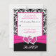 Esta tarjeta de respuesta de damasco en negro y blanco tiene una cinta rosa impresa y un broche de corazones de diamantes unidos con brillo impreso que coincide con la invitación de boda que se muestra a continuación. Si necesita otros artículos que coincidan o le gustaría en otra combinación de colores, por favor envíe un correo electrónico a niteowlstudio@gmail.com con su solicitud.
