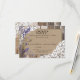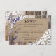 Diseño de tarjeta de respuesta de boda country western rústica con flores de lavanda azules y encaje blanco sobre fondo de lino y tablones de madera envejecida.