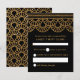 Esta tarjeta de respuesta a una decoración de arte negro y dorado mantiene el aspecto romántico oscuro de la suite con cajas blancas para que los clientes escriban su información. Las vieiras purpurinas de oro falsas se extienden por la parte superior de la tarjeta y cuentan con un respaldo similar para unir el conjunto de la suite.