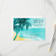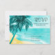 Una carta de respuesta RSVP de playa de moda con palmeras en la playa. Mostrado en tonos azul verde azulado y naranja.