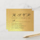 Una respuesta RSVP económica para una boda negra y dorada. Solo tiene texto negro, líneas y cuadrados sobre fondo de lámina dorada falsa. El título RSVP y la letra M están escritos en una elegante letra cursiva caligráfica, el resto en mayúsculas.