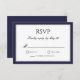 Tarjeta de respuesta de RSVP con borde azul marino y gris. Texto con bloque y letra cursiva elegante. Reverso azul marino.