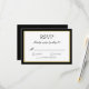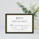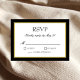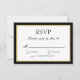 Tarjeta de respuesta de RSVP de boda clásica en blanco y negro con un toque de oro. Texto de bloque y escritura elegante dentro de un borde negro y tono de oro. Fondo negro.