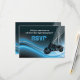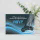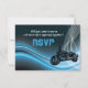 Tarjeta de respuesta de RSVP de boda de motociclista de carretera azul, con una motocicleta en un fondo degradado abstracto azul, blanco y negro y una malla blanca. Algunos elementos cortesía de Clipartandfonts.com.