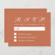 Un presupuesto simple y minimalista para un boda. Tiene sólo un texto blanco sobre fondo de terracota (un matiz moderno de marrón). El título RSVP y la letra M (que tiene color de barro) están escritos en un guión caligráfico elegante, el resto en mayúsculas.