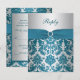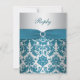 Esta elegante tarjeta de respuesta de boda en damasco gris plateado y azul turquesa tiene una cinta con aspecto de satén IMPRIMIADO y una hebilla de diamantes IMPRIMIDOS que coincide con la invitación de boda que se muestra a continuación. El texto y el tipo de papel son personalizables. Algunos de los papeles alterarán el color del diseño. NO usaría los papeles metálicos dorados, champán o plateados, ya que oscurecerán el diseño y descolorarán el blanco de los diamantes sin agregar ningún brillo adicional que lo que obtendría con el papel metálico hielo. El papel de fieltro también descolorará el diseño. TAMBIÉN, si cambia el tamaño de la invitación, o si cambia las fuentes, o el tamaño de la fuente, parte del diseño y/o texto pueden cortarse. Todo se imprimirá como lo ve en su monitor. No veré su invitación, y Zazzle NO corregirá nada (errores tipográficos, desalineación, etc.). Si necesita ayuda con esta invitación, por favor envíeme un correo electrónico ANTES de realizar su pedido. Si requiere algún artículo coincidente, o si le gustaría tenerlo en otra combinación de colores,