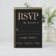 Tarjeta RSVP moderna y elegante en negro y dorado. Huelga Minimalista dorada. Esta tarjeta se puede editar fácilmente con su texto personal.