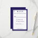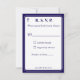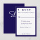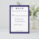 El diseño del anverso presenta el formato tradicional para una tarjeta de respuesta de boda en una fuente azul marino sobre un fondo blanco. La imagen de una cruz se muestra en la esquina superior. Todo el diseño está enmarcado por un borde elegante azul marino y blanco.